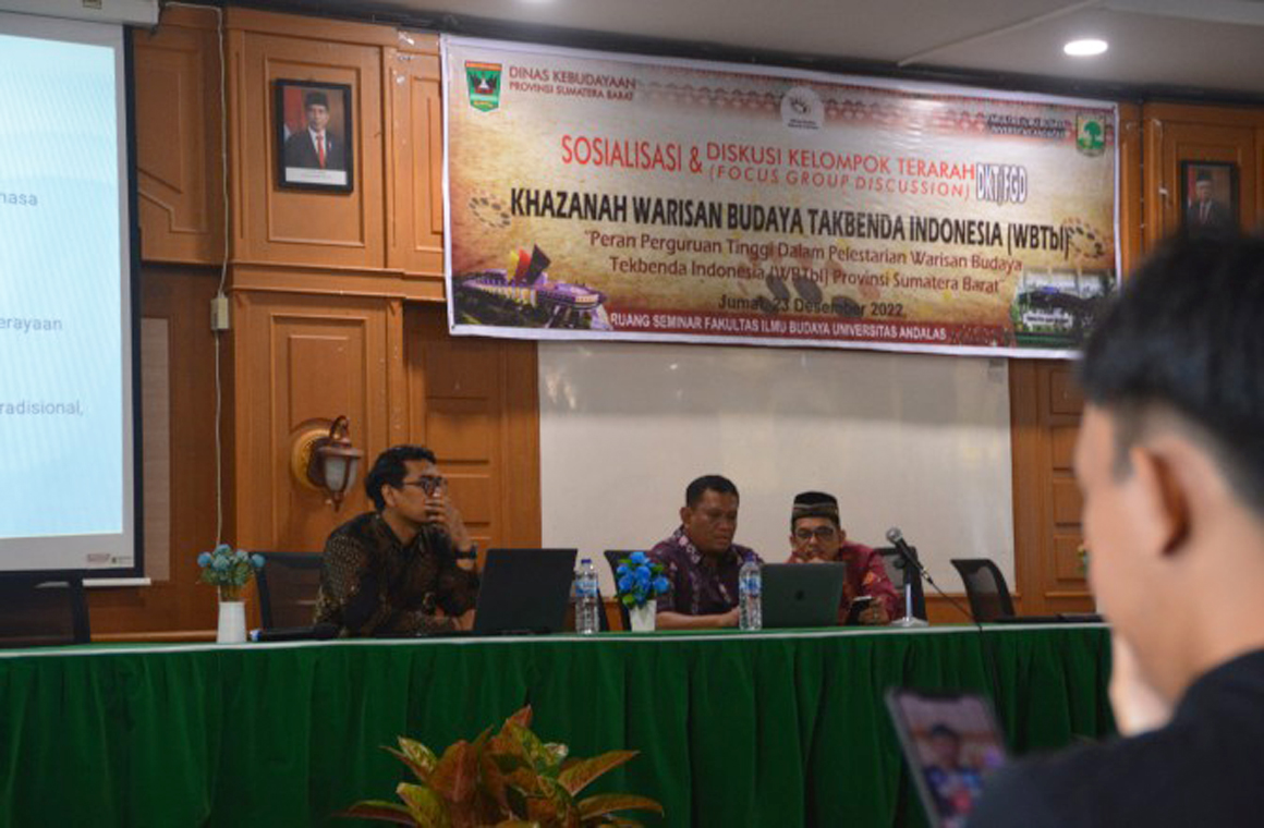 Padang (Departemen Ilmu Sejarah FIB UNAND) – Sosialisasi dan diskusi kelompok terarah Khasanah Warisan Budaya Tak Benda Indonesia (WBTbI) dengan tema "Peran Perguruan Tinggi Dalam Pelestarian Warisan Budaya Takbenda Indonesia (WBTbI) Provinsi Sumatera Barat" diselenggarakan pada Jumat, 23 Desember 2022 di Ruang Seminar FIB Universitas Andalas. Acara tersebut dihadiri oleh Dekan, Wakil Dekan, Dosen, Tim Dinas Kebudayaan Provinsi Sumatera Barat, Mahasiswa dan Umum.