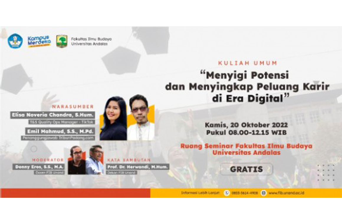 Fakultas Ilmu Budaya Universitas Andalas mengundang dua narasumber inspiratif, lulusan dari Fakultas Ilmu Budaya Universitas Andalas. Narasumber pertama bernama Elisa Noveria Chandra, S.Hum. alumni Sastra Inggris yang bekerja sebagai Quality Ops Manager di Tik Tok. Narasumber kedua, Emil Mahmud, S.S., M.Pd. alumni Ilmu Sejarah