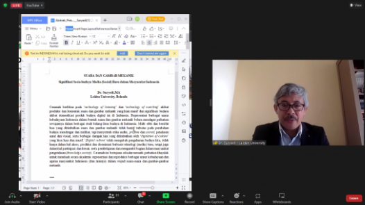 Dr. Suryadi, MA memberikan case sudy mengenai representasi baru agama dalam sosial media. Misalnya perdebatan mengenai digital Quran, penggunaan kamera untuk selfie di Mekah Masjidil Haram. Sebagai penutup dalam presentasi materi kuliah umum ini menurutnya “Dengan keberadaan FIB misalnya dapat mengembangkan Culture Studies dan The Study Media Culture dan sebagainya. Jika bisa saling terhubung dengan akademik internasional dan dapat dipublikasikan dalam jurnal-jurnal internasional.”